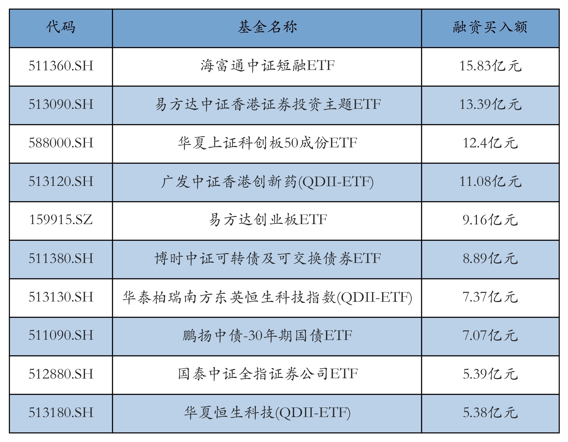9月5日ETF融资买入额前三位分别为:海富通中证短融ETF(15.83亿元)、易方达中证香港证券投资主题ETF(13.39亿元)和华夏上证科创板50成份ETF(12.4亿元),前10具体见下表: