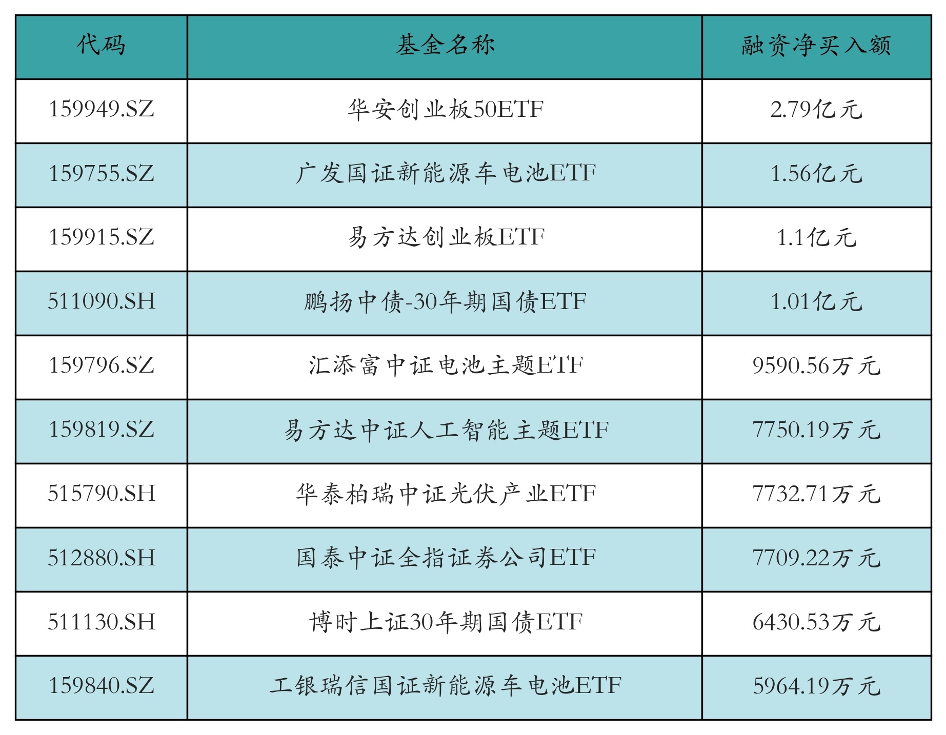 9月5日ETF融资净买入额前三位分别为:华安创业板50ETF(2.79亿元)、广发国证新能源车电池ETF(1.56亿元)和易方达创业板ETF(1.1亿元),前10具体见下表: