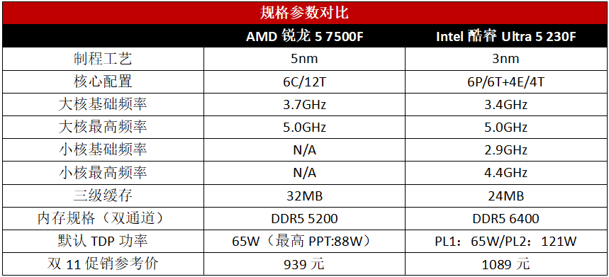 反观酷睿Ultra 5 230F其劣势主要有三点:首先4个小核在游戏中完全没用,浪费了预算又白白费电;其次别看其是Intel最新一代,可游戏性能反而出现了“倒吸”,甚至还不如上一代产品,自然也要弱于锐龙5 7500F;最后是价格,酷睿Ultra 5 230F在近期降价倒是挺猛,双十一价格已经来到了1089元,可还是贵了。再加上更高的功耗对配件的要求更高,显然会大幅提升装机的成本。
