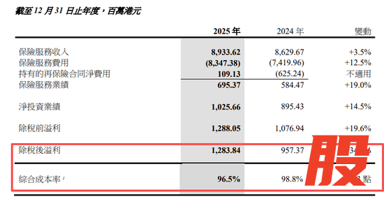再保险业务方面,2025年实现除税后溢利12.84亿港元,同比增长34.1%,综合成本率降至96.5%,较上年下降2.3个百分点,业务盈利能力与风险管控水平同步改善。
