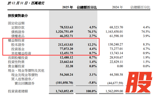 其中,股票投资账面价值达2124.13亿港元,同比增长63.09%;此外,公司试点开展黄金投资,年末贵金属投资规模为32.38亿港元,资产配置多元化程度进一步提升。