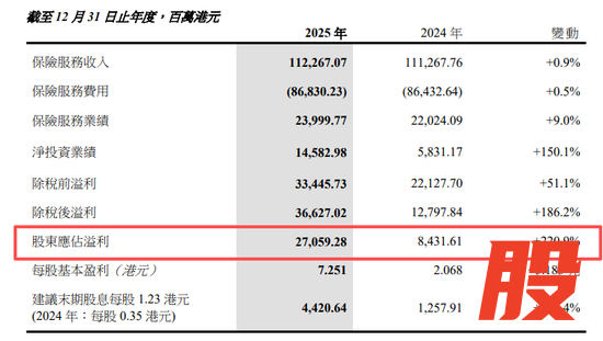 数据显示,集团股东应占溢利达270.59亿港元,较上年同期的84.32亿港元增长220.9%,创下公司成立以来的最高纪录;同期实现保险服务收入1122.67亿港元,同比增长0.9%。